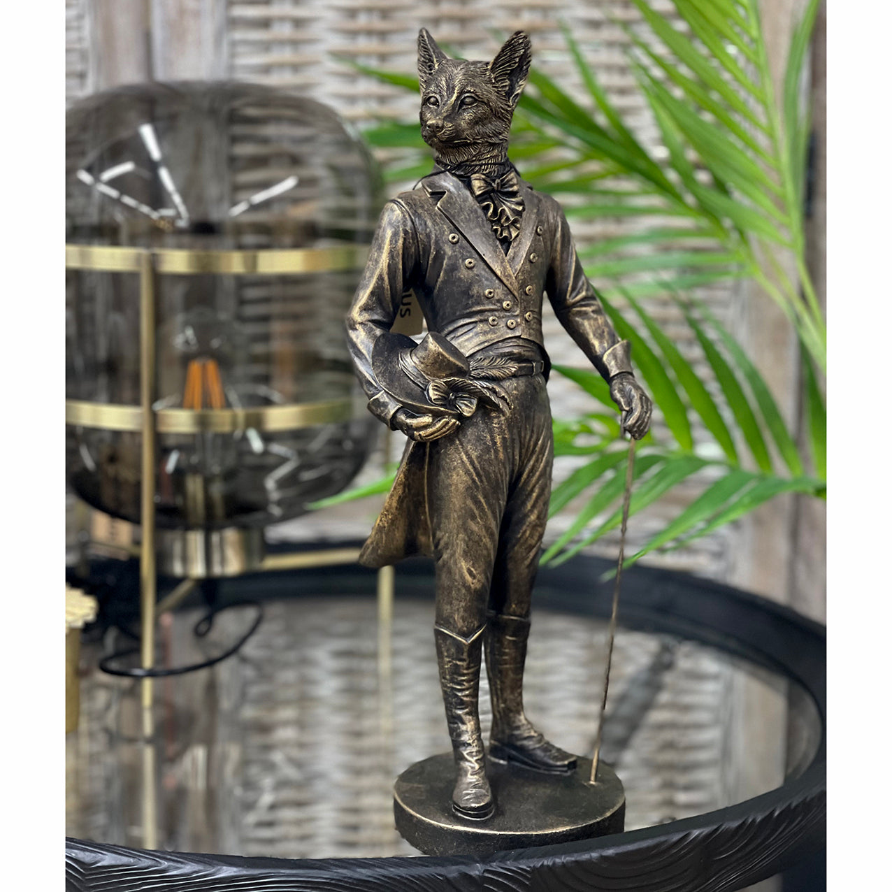 A charming and meticulously crafted bronze figurine of Mr Fox, embodying both elegance and cunning. Standing upright in a classic, dapper pose, this fox is depicted in mid-century attire, complete with a tuxedo, hat and cane, exuding a sense of sophistication and wit. The rich patina of the bronze highlights the fine detailing of his tailored clothing and expressive features. Perfect as a whimsical yet classy decor piece, this figurine brings a touch of woodland and fantasy to any shelf, desk or mantelpiece.