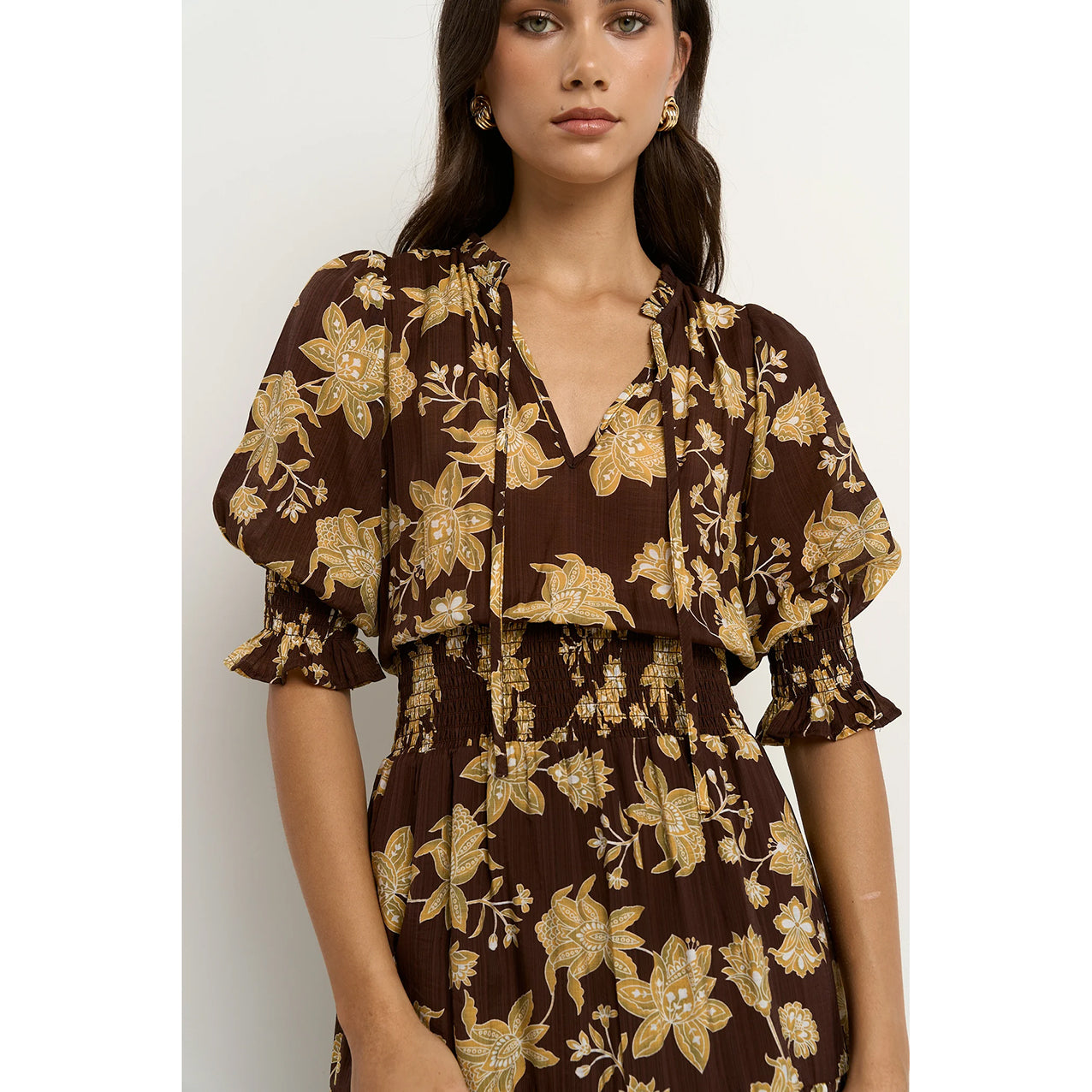 The Charlie dress is your go-to for flowy, feminine ease with a rich chocolate base and golden florals that feel like pure romance. With its soft shirring through the waist and puff sleeves that frame the shoulders just right, this dress creates a silhouette that moves with grace and flatters from every angle. Perfect for high-low styling, it pairs beautifully with strappy heels for occasion moments or casual flats for effortless everyday charm.
