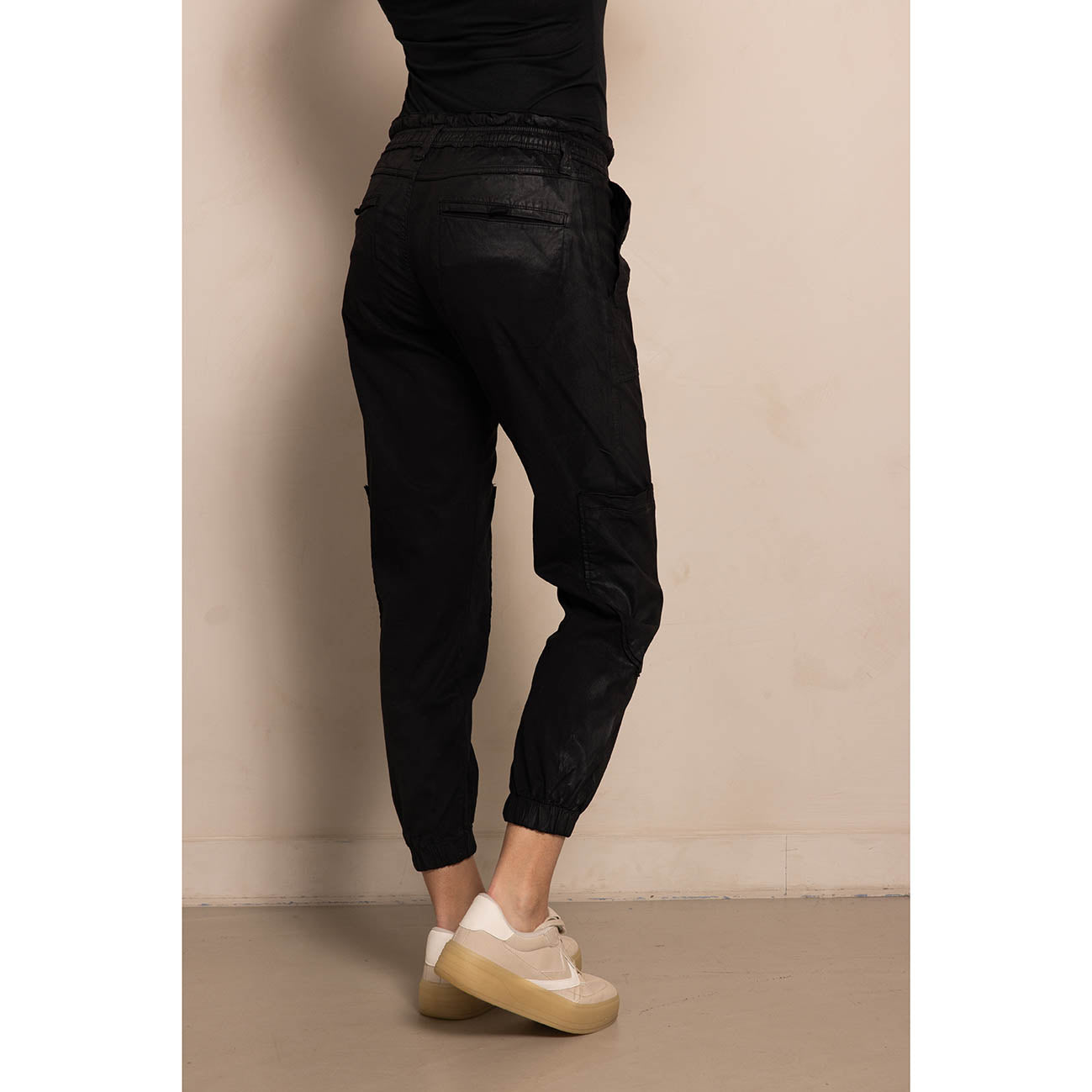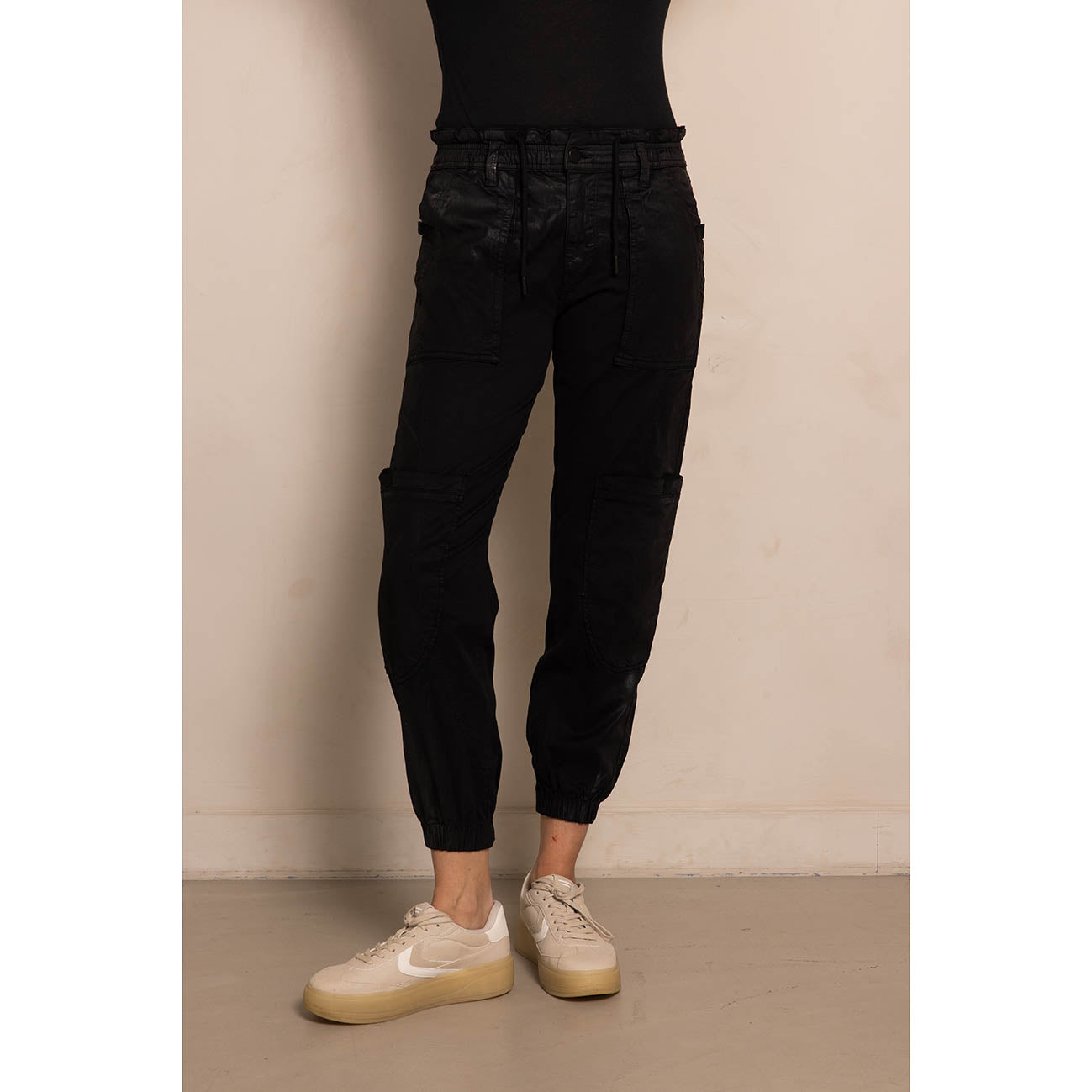 - Elastic waistband with drawstring and cord + button with zip