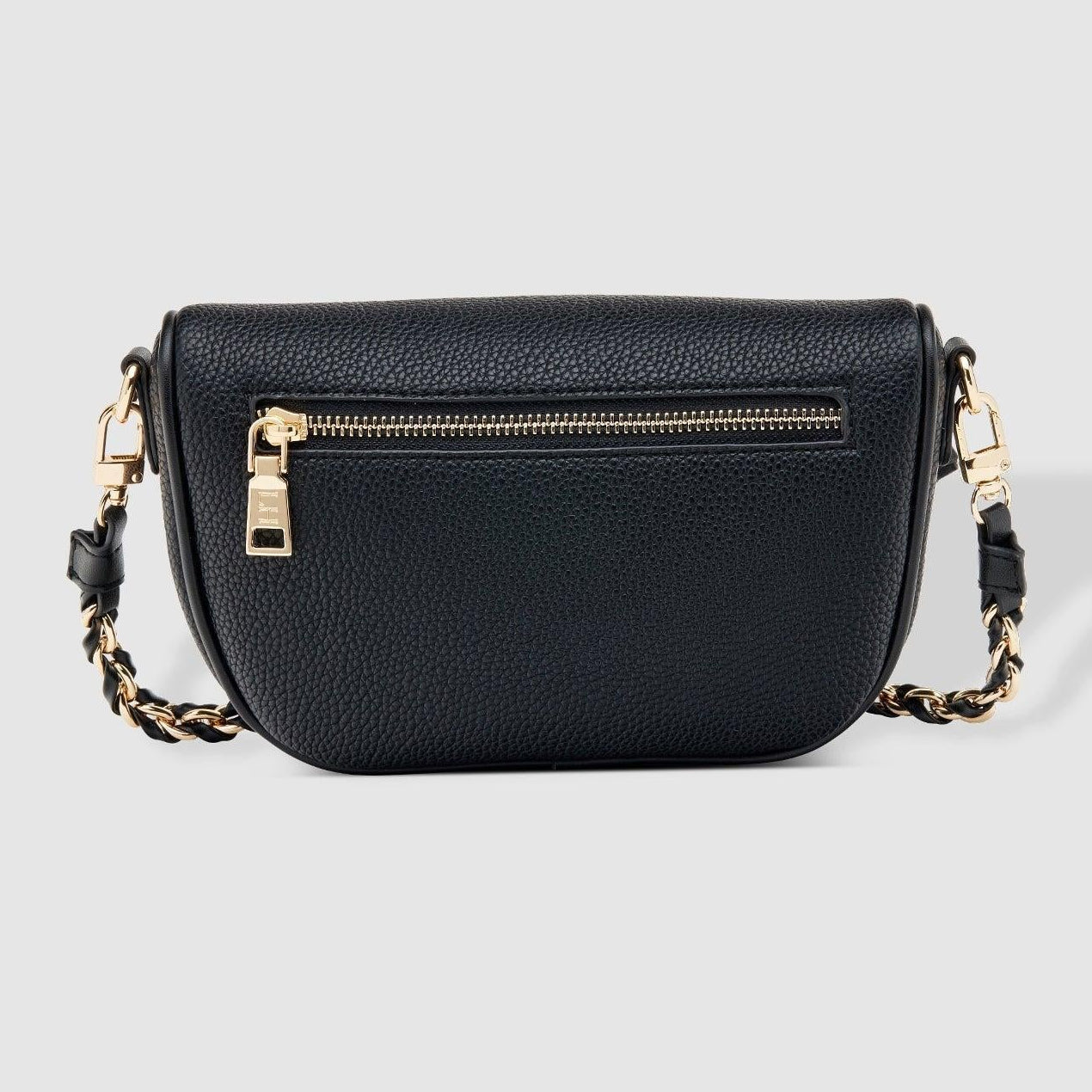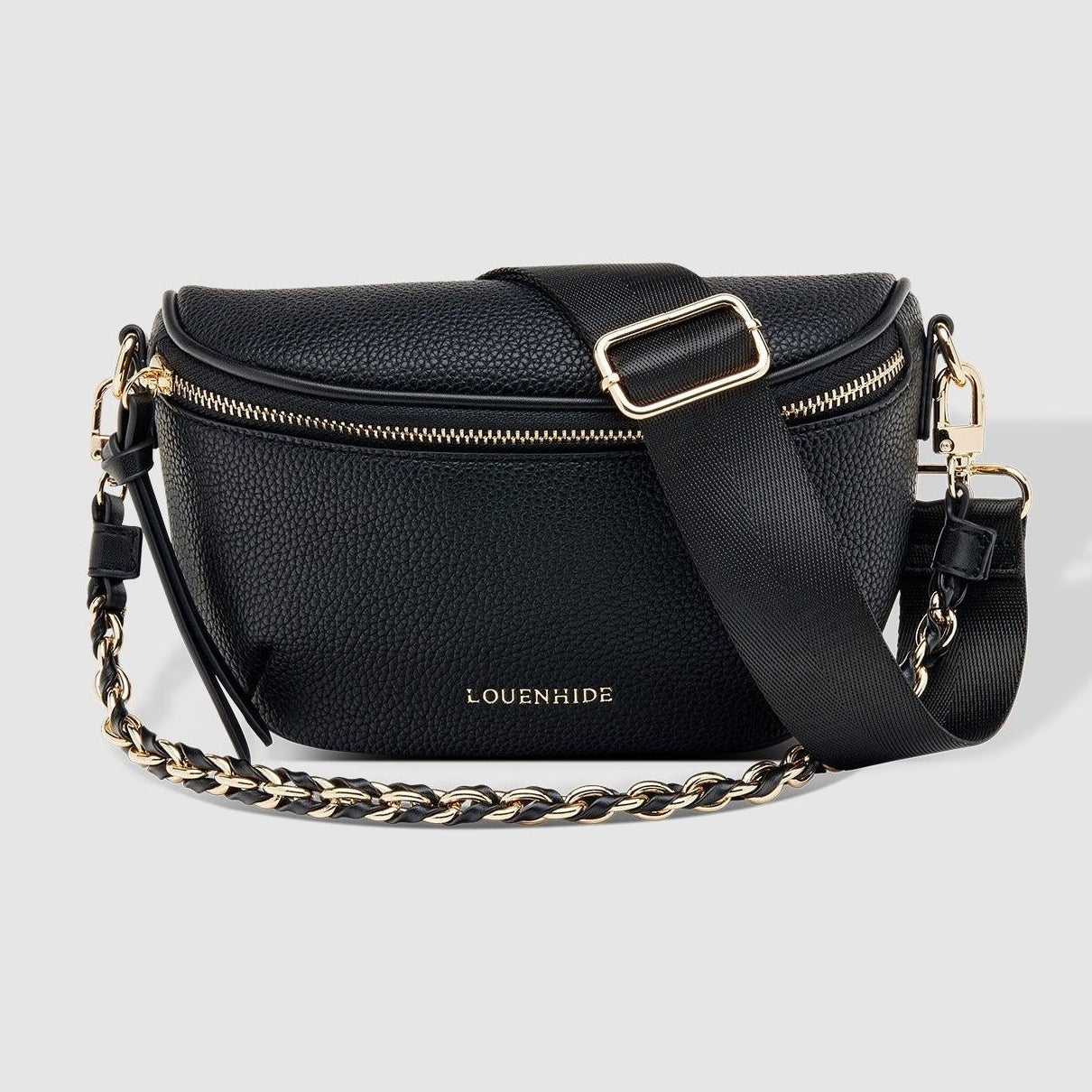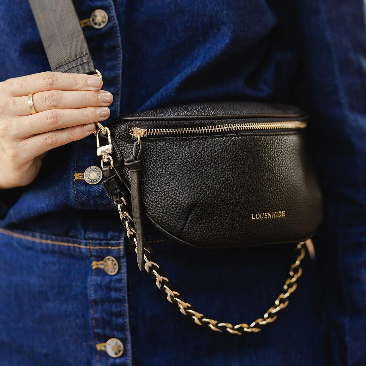 The Louenhide Halsey Black Sling Bag is where active meets an urban lifestyle. Your new go-to for fuss free functionality, this soft vegan leather bum bag is designed with a secure front zip closure, backside zip pocket and internal zip pocket to keep all your belongings safe when you are on-the-go. Designed thoughtfully to compliment your active schedule with unsurpassed style, wear her with the woven vegan leather chain shoulder strap for elevated style or with the adjustable sateen guitar strap for casual comfort. Whether over the shoulder or as a sling crossbody bag the Halsey Black is the perfect fit for your everyday or travel needs.