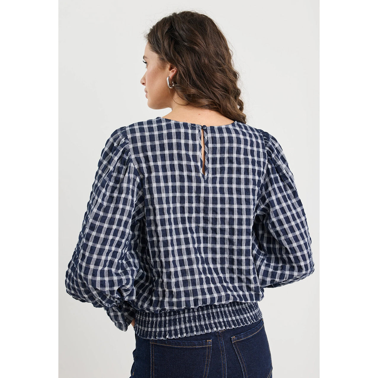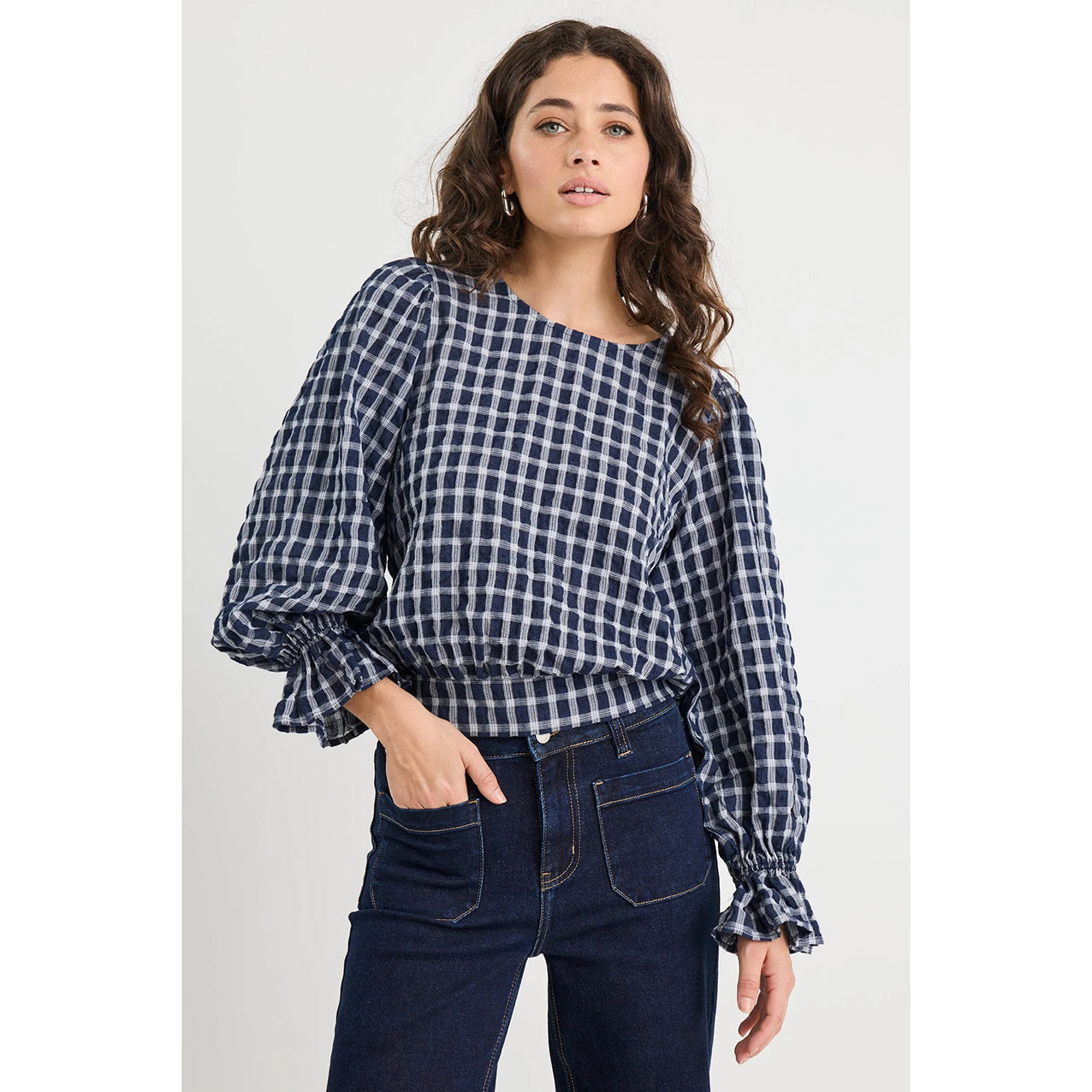 An easy statement piece in a navy ink check, this long sleeve top features softly gathered shoulders and ruffled cuffs for a touch of volume. Designed with a shirred back waist panel for shape and comfort, it’s crafted from a lightweight lyocell blend with a subtle texture through the check. Pair it with denim or tailored trousers for elevated everyday dressing.