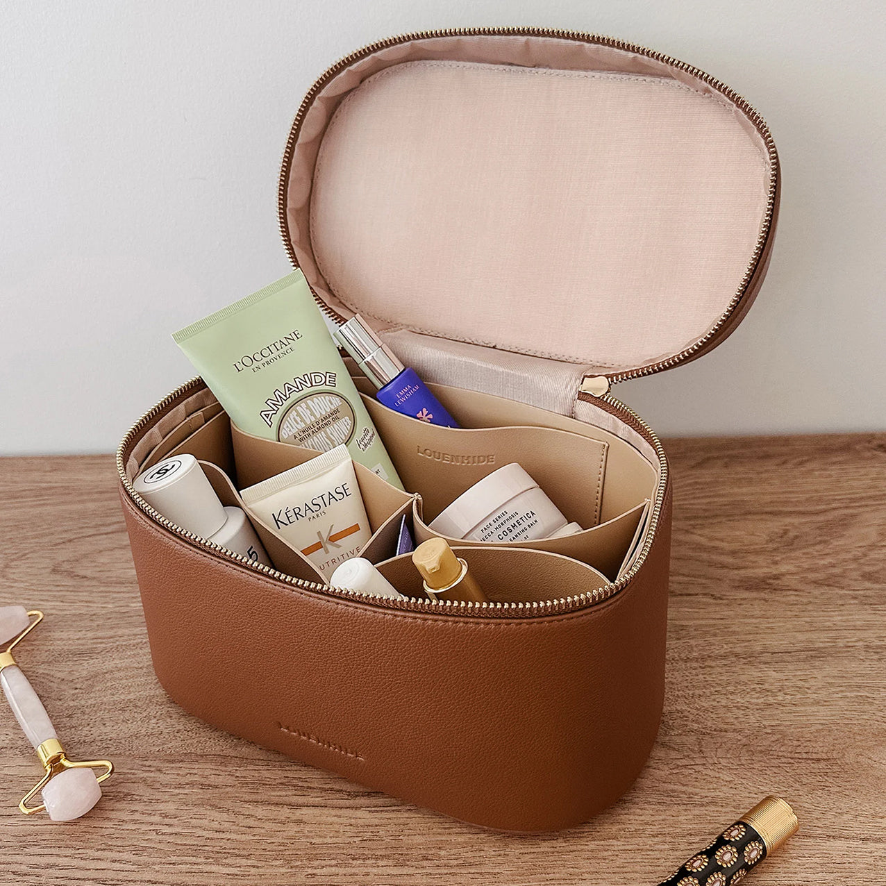 The Juliette Vanity Case is the ultimate travel beauty case with a handle - designed to keep your cosmetics, skincare, and accessories beautifully organised, wherever the season takes you. Crafted from buttery soft vegan leather in a sleek, structured silhouette, she opens to reveal a removable insert with divider and three slip pockets, giving every item a dedicated place. Whether you're packing for a weekend away or curating your daily essentials, this versatile cosmetic case blends everyday functionality with elevated style. Finished with refined details and a practical top handle for effortless carrying, Juliette Tan is the perfect plus-one for beauty lovers on the move.