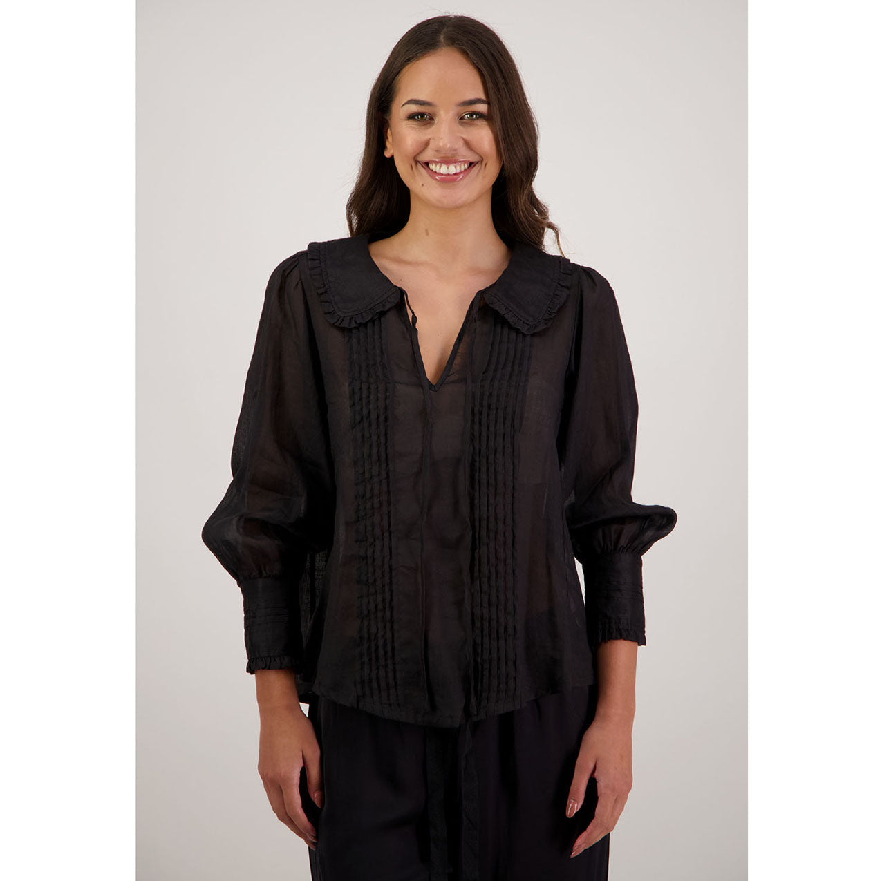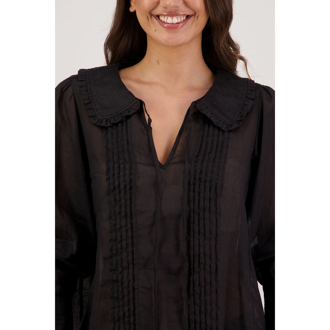 The Richie Shirt is a beautifully detailed style crafted from 100% ramie, offering a lightweight, breathable feel with natural texture. Designed with delicate pintucks through the body, it features a shaped collar finished with soft ruffles and a feminine tie. Full-length sleeves with pintucks and buttoned cuffs complete the look, making Richie an effortlessly elegant piece for everyday or elevated dressing.