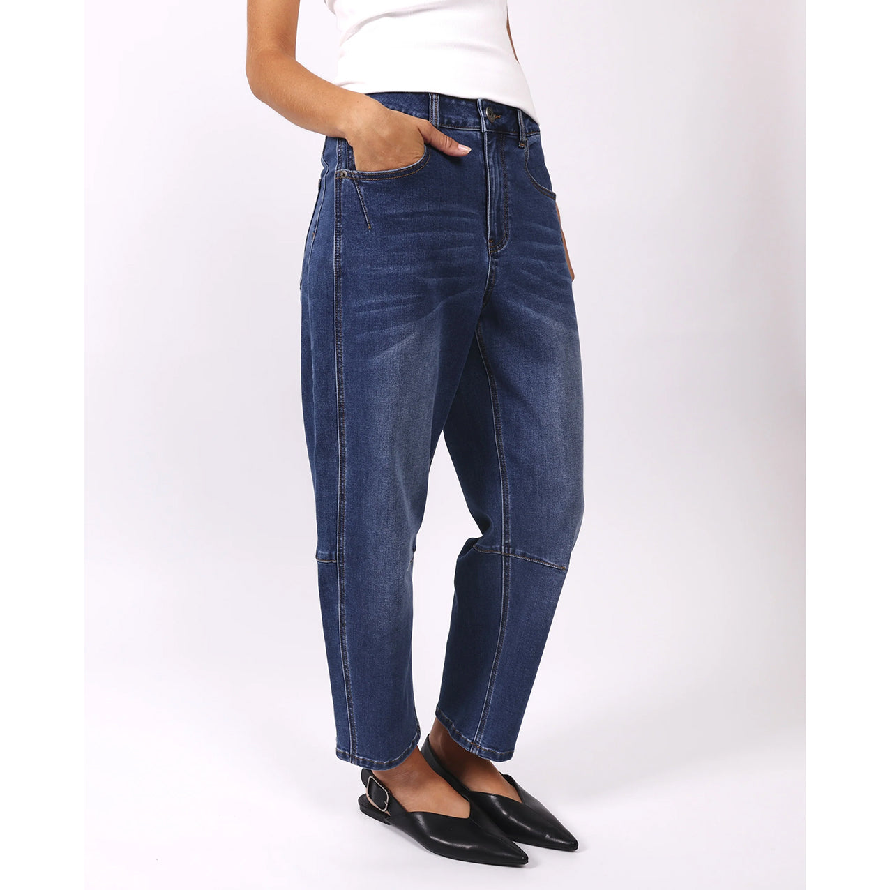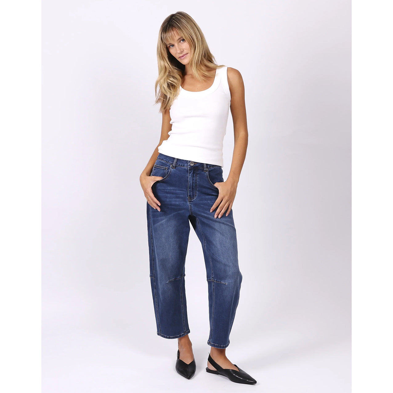 Characteristics of Toni Barrel-Leg Jeans include a fitted waist, flared-out shape around the mid-leg, and tapered silhouette at the bottom, which exudes the look of, well, a barrel. It's the vibe of a cowboy ready for a showdown in the Wild, Wild West!!!