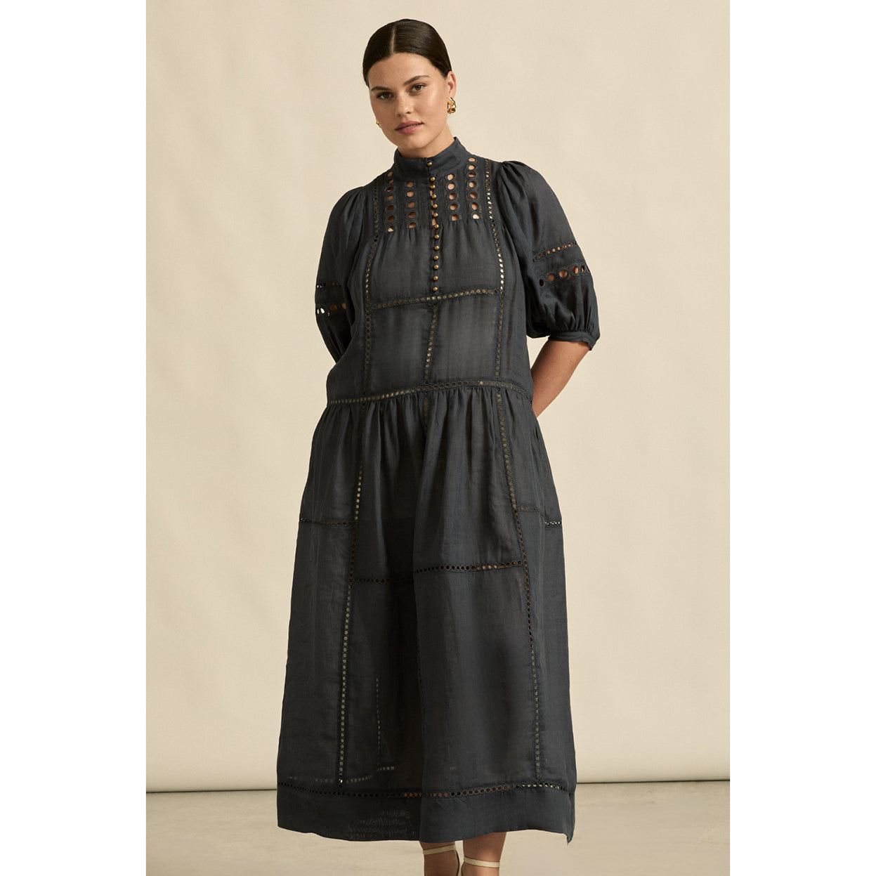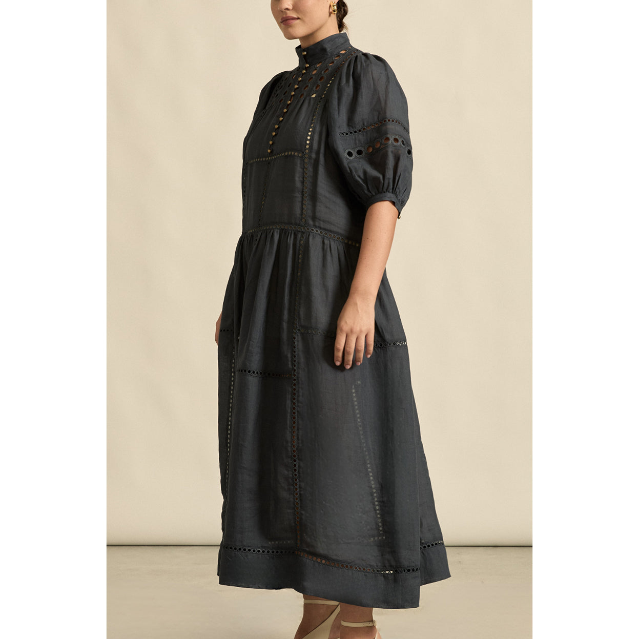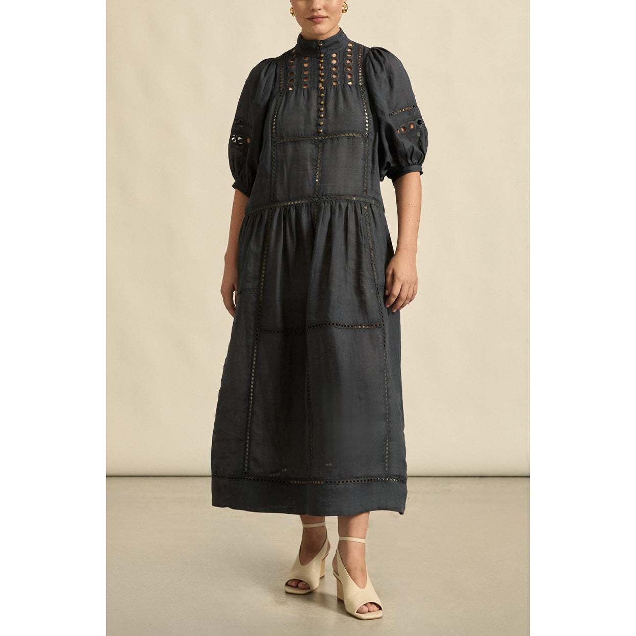 Ornate detailing and a relaxed silhouette define the impel dress. with circular lace trims and vintage brass buttons, this piece balances presence with polish.